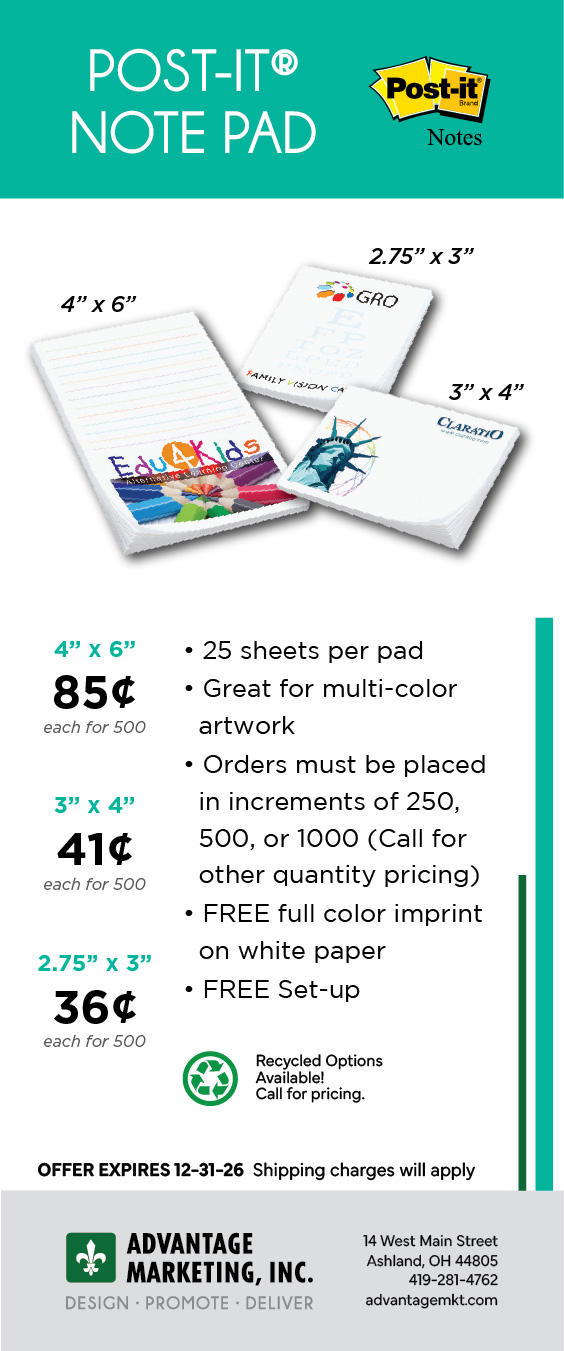 Click the image above to view our Featured Product Guide for the most popular promotional products of 2026! POST-IT® NOTE PADSpecial price of $0.85each for 500+Offer Expires: 12/31/26More Info SCOTCH® LINT SHEETS POCKET PACKStarting at $2.11each for 500Offer Expires: 12/31/26More Info COMMAND® BRAND CUSTM PRINTED MEDIUM HOOKSpecial price of $1.39 each for 500+Offer Expires: 12/31/26More Info EUROGEL COMFORT PENSpecial price of $0.80each for 250+Offer Expires: 12/31/26More Info QUEEN BEE COMFORT PENSpecial price of $0.94each for 250+Offer Expires: 12/31/26More Info MICRO-FIBER CLOTHSpecial price of $0.93 each for 150+Offer Expires: 12/31/26More Info REVOLUTION UMBRELLASpecial price of $9.95each for 25+Offer Expires: 12/31/26More Info LOOPER MAGNETIC PHONE GRIPSpecial price of $6.95each for 50+Offer Expires: 12/31/26More Info